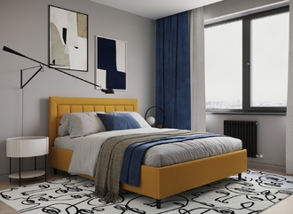 Стежка помещена в центр изголовья и обрамлена, словно картина. Объемные царги завершают цельную фигуру кровати и становятся гармоничным дополнением ее образа.