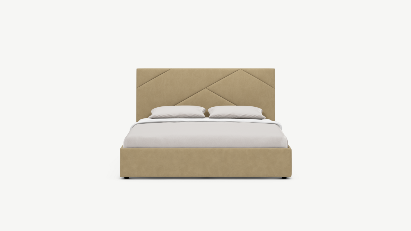 MOON FAMILY 1257 привлекает внимание оригинальным исполнением: широкие полосы ткани эффектно пересекают периметр изголовья, создавая на нем графический орнамент. Элегантным и практичным акцентом служат скрытые карманы, расположенные по его углам. Лаконичные формы объемных царг создают единый гармоничный образ и фокусируют внимание на центральном текстурном элементе кровати.