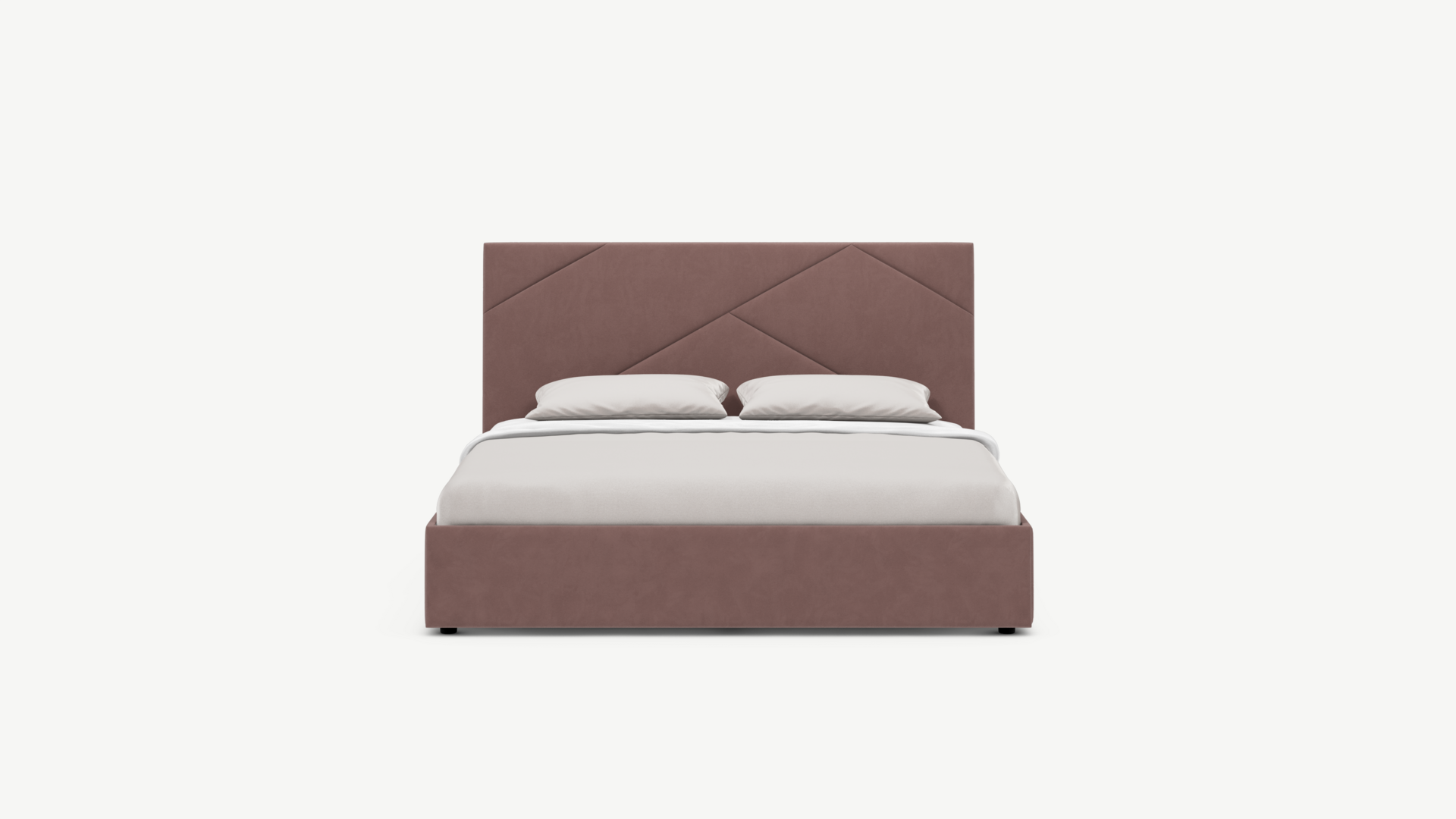 MOON FAMILY 1257 привлекает внимание оригинальным исполнением: широкие полосы ткани эффектно пересекают периметр изголовья, создавая на нем графический орнамент. Элегантным и практичным акцентом служат скрытые карманы, расположенные по его углам. Лаконичные формы объемных царг создают единый гармоничный образ и фокусируют внимание на центральном текстурном элементе кровати.