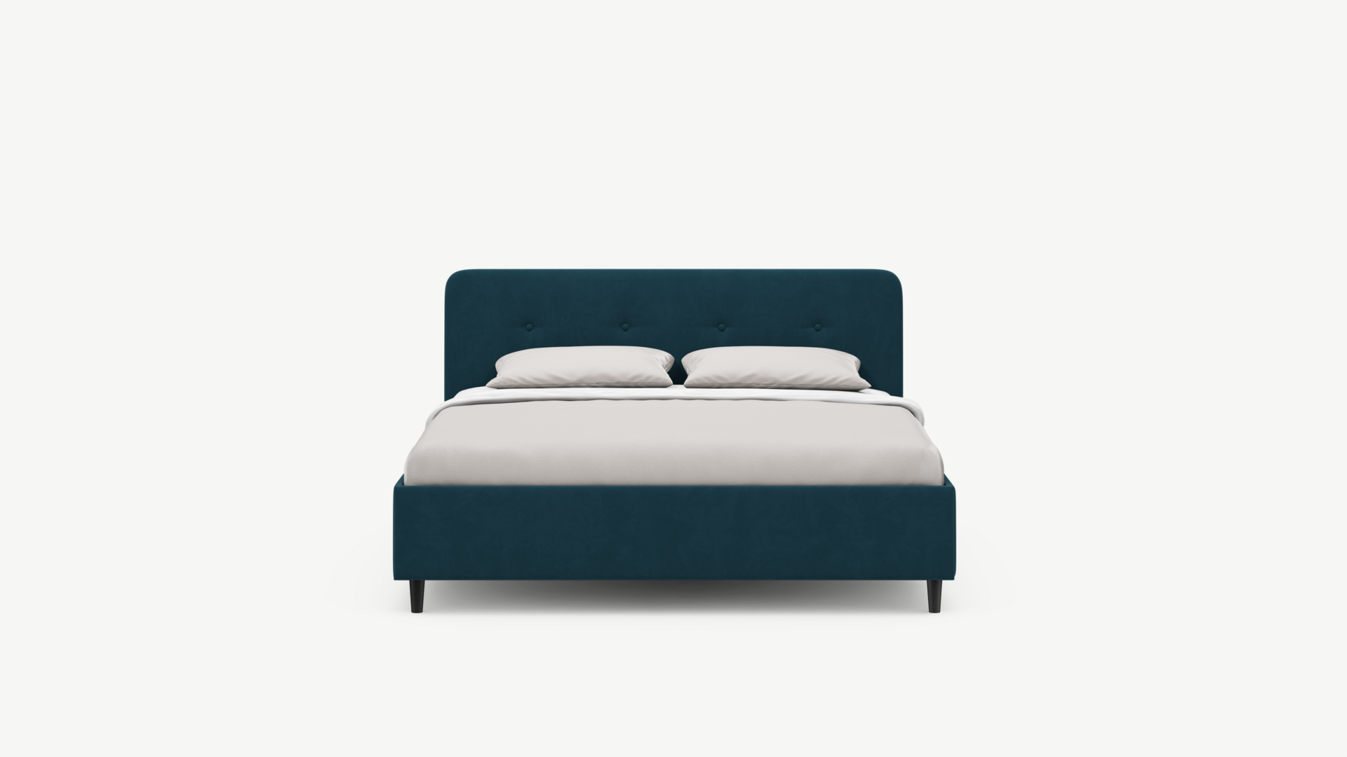 Царга, задающая пропорции, благодаря гладкости своей фактуры подчеркивает центральный элемент декора. Высокие опоры приподнимают фигуру кровати над полом и добавляют её образу визуальной легкости.