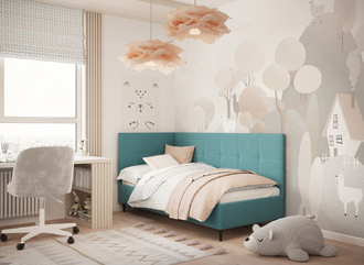Угловая односпальная кровать MOON FAMILY 1261 с мягкой спинкой и изголовьем создаст в Вашей спальне ощущение уюта. Крупная квадратная стежка привносит в интерьер графических акцентов, а вставка из пуговиц наполняет пространство ощущением домашнего тепла.