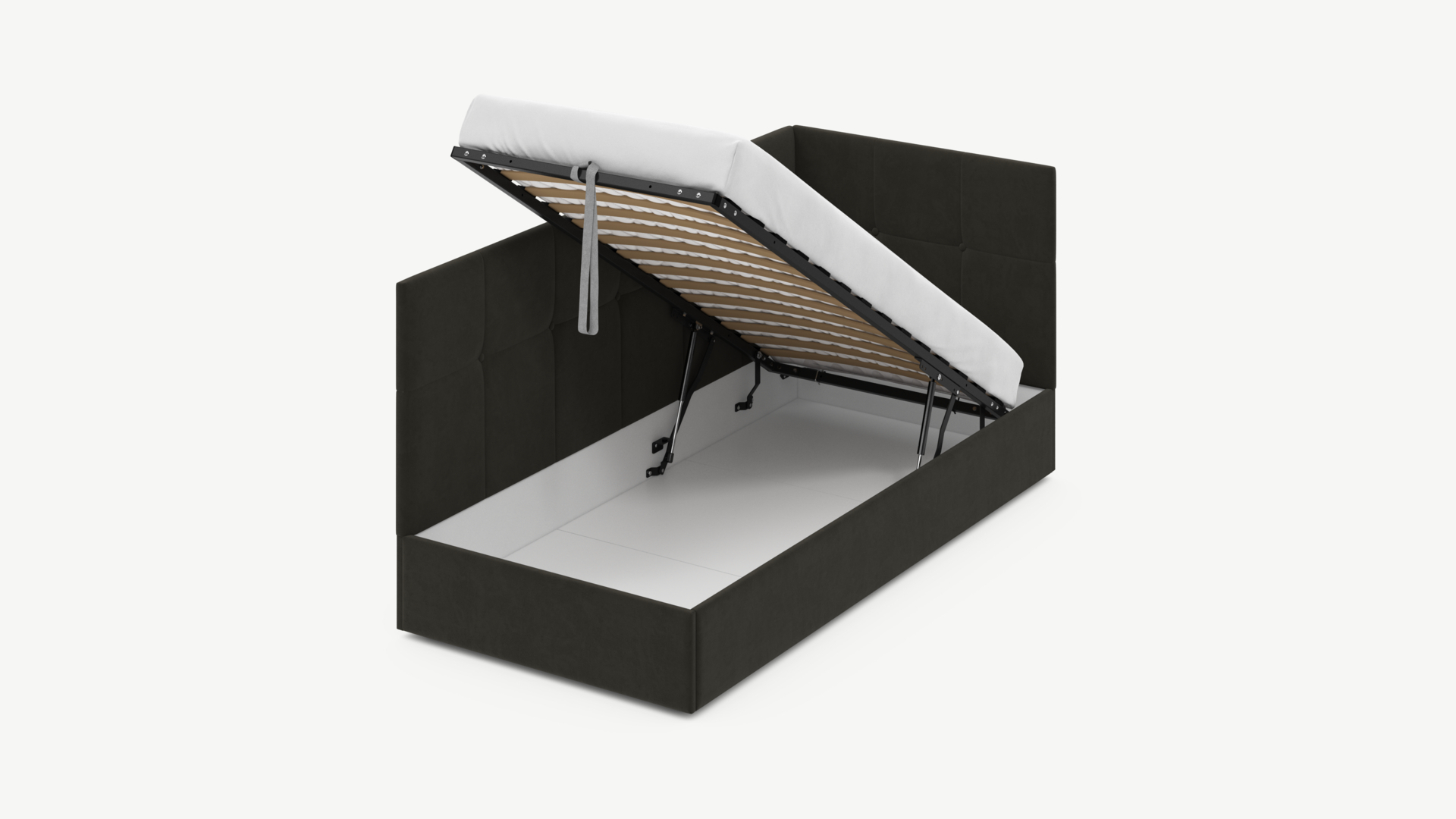 • Скрытая под основанием вместительная емкость без внутренних перегородок позволяет использовать всю площадь подкроватного пространства для хранения вещей.