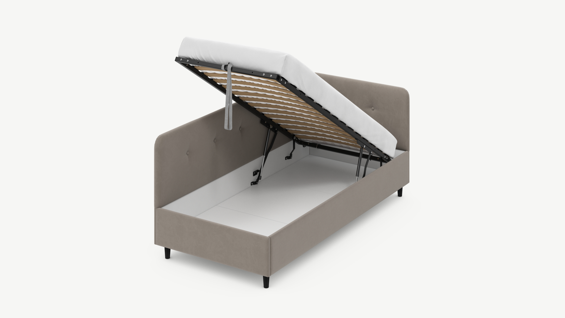 • Скрытая под основанием вместительная емкость без внутренних перегородок позволяет использовать всю площадь подкроватного пространства для хранения вещей.