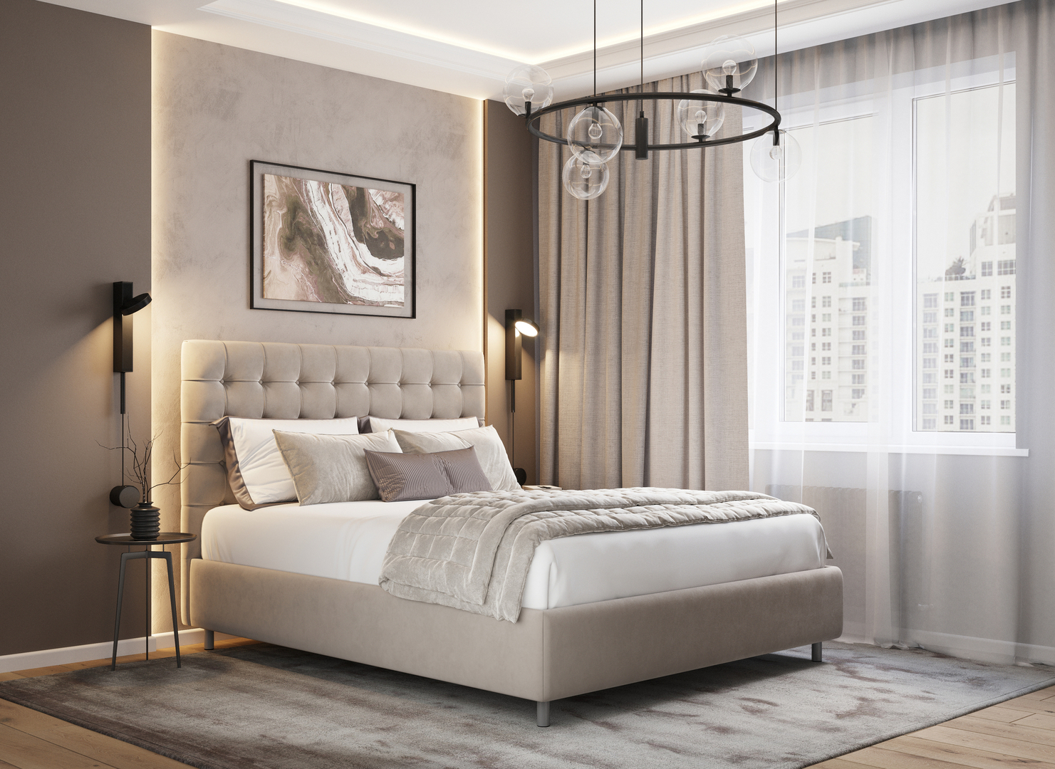Разнообразие цветовой палитры позволит подобрать желаемый оттенок обивочной ткани. Использование светлых цветов поддержит настроение стиля «Сканди». Приглушенные насыщенные оттенки оформят кровать в стиле «Лофт». Нейтральные оттенки в цвет интерьера обыграют спальню в Современном стиле.